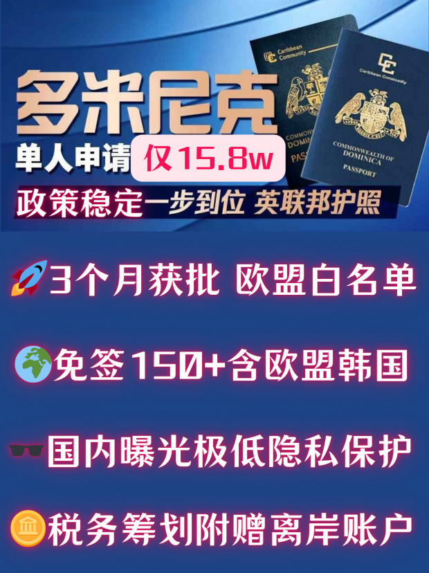多米尼克投资公民计划始于1993年,由《多米尼克国宪法》制定。为了促进该计划的发展,多米尼克总理在2014年10月宣布修订及完善有关立法。项目为申请人提供众多便利条件:审理时间短,可拥有双重国籍,免签访问119个国家,如英国、新加坡等国家,并且免签申根国家,让世界范围内的旅行变得更方便。多米尼克首都为罗索,官方语言为英语,人口7万人